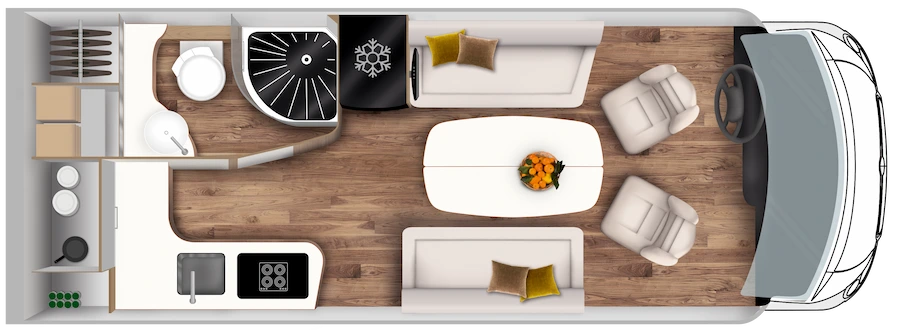 Der Le Voyageur 7.9 GJL ist mit einem automatischen Absorptionskühlschrank mit Außenlüftungsgitter ausgestattet, der ein Volumen von 175 Litern bietet.