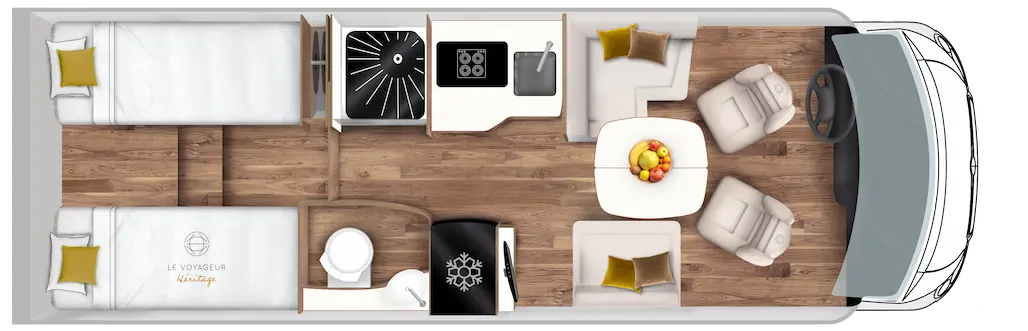Im Le Voyageur Héritage 7.9 GJL befinden sich im Heck zwei feste Einzelbetten mit den Maßen 80 × 190 cm und 80 × 200 cm. Zusätzlich gibt es ein serienmäßiges Hubbett mit den Maßen 140 × 190 cm – ideal für Familie oder Gäste.