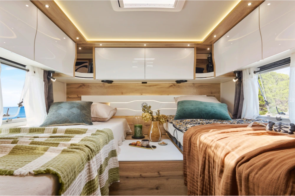 7.9 GJL: Zwei Einzelbetten im Heck und eine L-förmige Sitzgruppe, die eine gemütlichere Atmosphäre schafft.