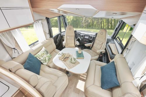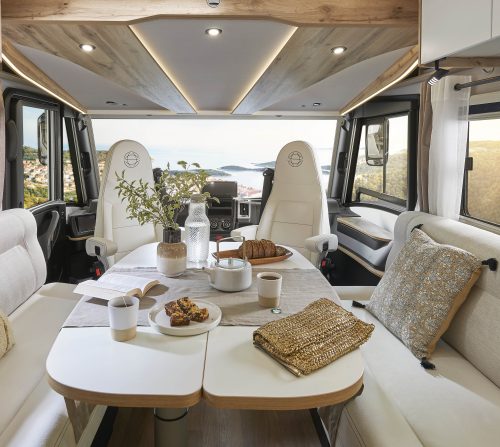 Die F-Sitzgruppe mit gegenüberliegenden Sitzbänken ist bei Le Voyageur ein Meisterstück an Komfort und Funktionalität. Der klappbare Tisch schafft einen großzügigen Durchgang zwischen Wohnraum und Fahrerhaus, während die clever integrierten „Jack-in-box“-Sitze bis zu vier Sitzplätze ermöglichen.