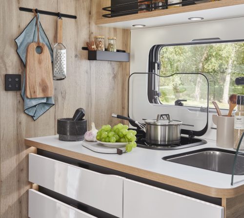 Die Küchen unserer Reisemobile überzeugen mit großzügigem Stauraum und durchdachtem Design. Unser technisches Know-how zeigt sich in jedem Detail: Die Spülenabdeckung lässt sich im Handumdrehen zur praktischen Arbeitsfläche umfunktionieren und ist mit einem integrierten Abtropfgestell ausgestattet – für höchsten Komfort und Funktionalität auf Reisen.