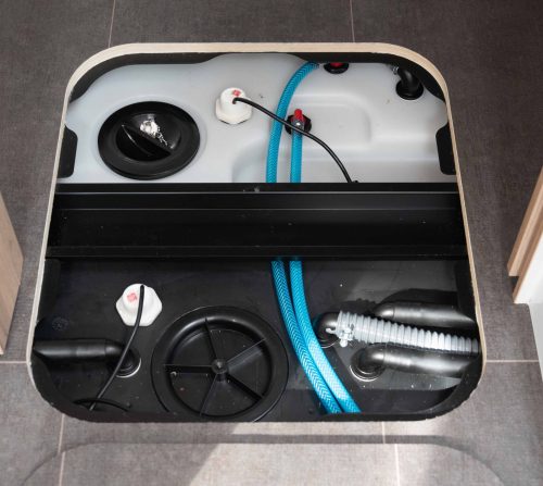 Das Ablassventil des Abwassers ist in den Technikfächern untergebracht. Es ist frostsicher und somit jederzeit, zu jeder Jahreszeit, einsatzbereit.