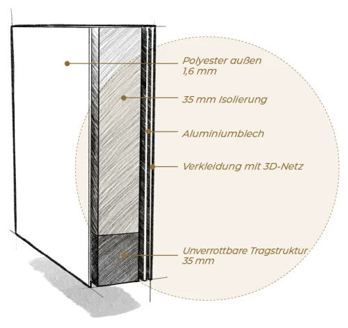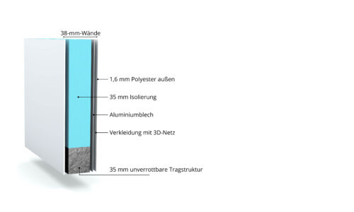 Die Wände der Eterna-Modelle sind 38 mm stark und bieten damit exzellente Isolationsqualität. So schützen sie ihre Nutzer zuverlässig vor Temperaturschwankungen und sorgen für ein komfortables Wohnklima – selbst bei extremen Wetterbedingungen.